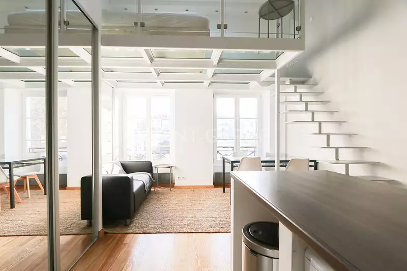 Rue du Faubourg Saint-Martin 75010 Paris - Appartement meublé sur cour dégagée au calme de 25.46 m² situé au 3ème et dernier étage sans ascenseur d'un immeuble de bon standing et gardienné composé d'une entrée, une pièce principale avec coin salon et dîner, une cuisine américaine entièrement équipée et aménagée (réfrigérateur, combiné micro-ondes four, hotte, plaques de cuisson, lave-linge, vaisselles, etc...), une coin nuit en mezzanine, une salle de douches avec WC. Calme, lumineux, gardien, local poubelle, interphone. Chauffage et eau chaude individuels électriques. Peinture et mobilier neufs. Proximité métro Louis Blanc (ligne 7, 7bis) et Jaurès (ligne 2, 5 et 7bis).