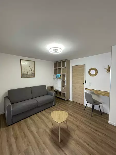 1er étage avec ascenseur composé d'un salon (muni d'un canapé convertible 2 places 140cm) avec cuisine ouverte et équipée, un petit coin bureau, une salle d'eau avec wc