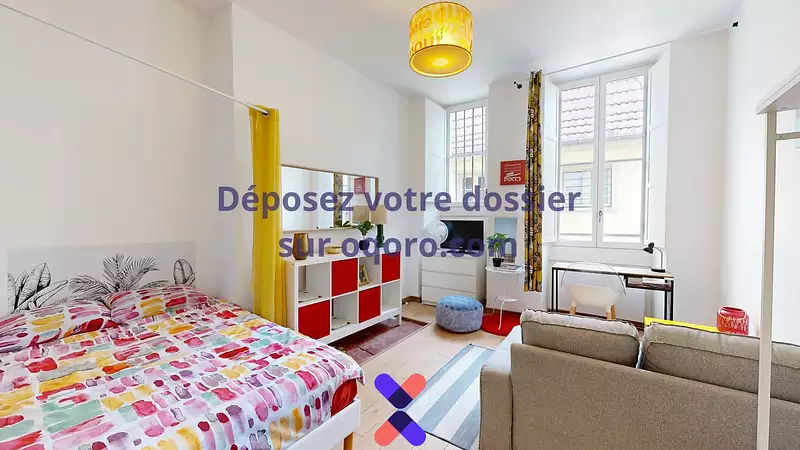 La pièce de vie est baignée de lumière grâce à deux grandes fenêtres, elle dispose d'un canapé, d'une table basse, d'une TV, d'un bureau, d'un lit double et de nombreux rangements, le parquet apporte une ambiance chaleureuse à l'ensemble.
