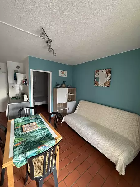 Cet appartement climatisé de 28 m² comprend une cuisine équipée, un séjour lumineux, une loggia avec cuisine et rangements, une chambre spacieuse ainsi qu'une salle d'eau avec WC.
