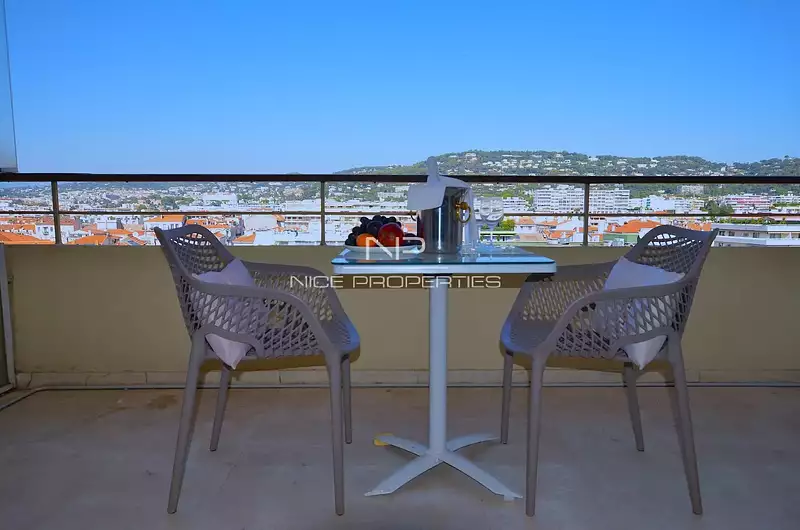 CANNES/CROISETTE : Studio 29 m2, terrasse 6,80 avec vue dégagée sur les collines, cuisine équipée, lit 160, salle de bain avec baignoire et double vasque.