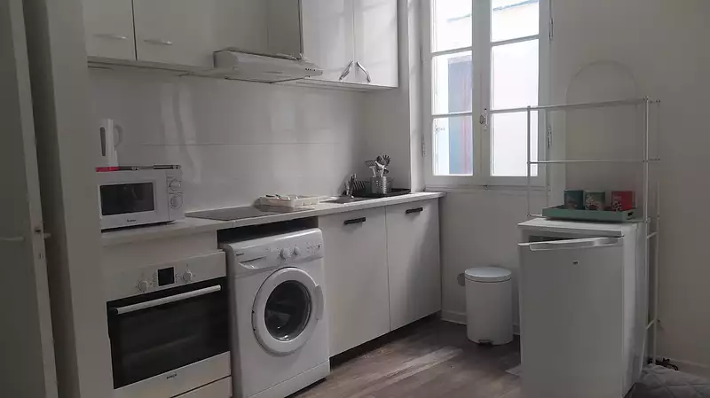 Quartier des Halles, cet appartement dispose d'une pièce de vie avec cuisine ouverte, entièrement équipée (lave linge, four, plaque cuisson, four micro onde),