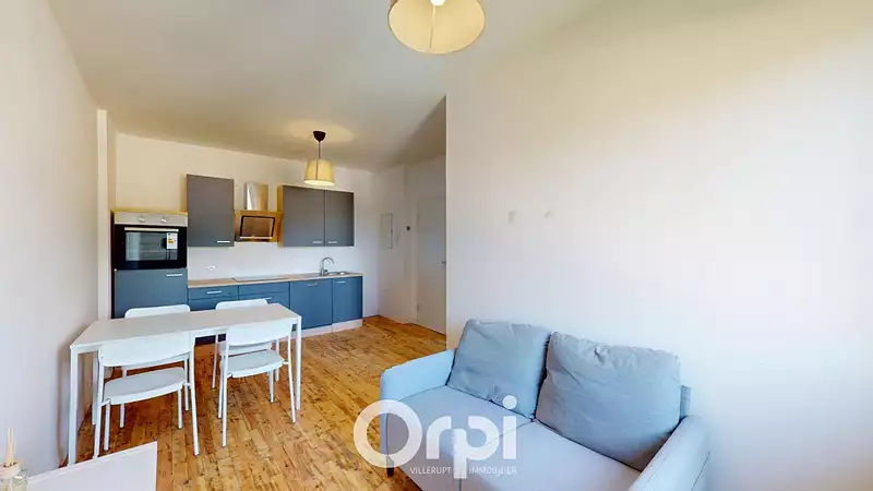 L'appartement comprend une pièce de vie lumineuse et bien agencée avec mobilier moderne, une cuisine équipée (réfrigérateur, plaques, hotte, four, vaisselle…), une chambre séparée avec lit double et armoire, une salle d'eau avec WC, ainsi qu'un espace buanderie privatif sur le palier.