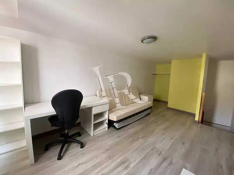 Appartement composé d'un hall d'entrée, une salle d'eau avec douche et toilettes, une pièce de vie avec une kitchenette et à l'étage une chambre.