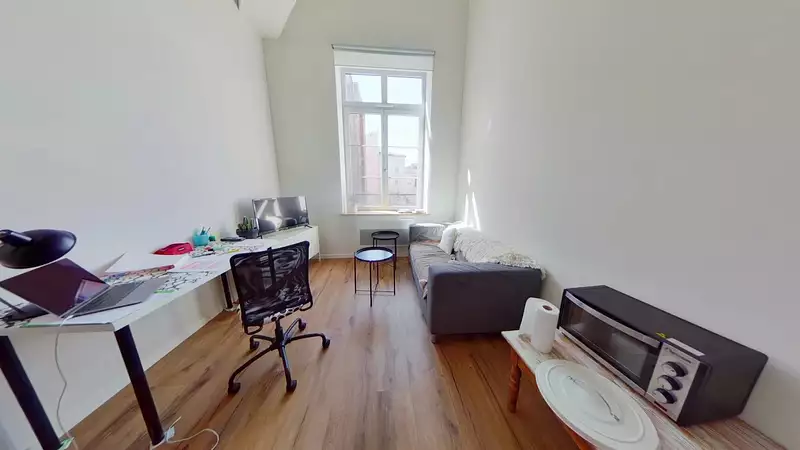 Il se compose d'une entrée desservant une salle de douche, une cuisine équipée en mobilier (plaque de cuisson, four micro-ondes, frigo), un espace séjour (canapé, meuble tv) et une mezzanine donnant accès à un espace nuit équipé d'un lit, d'un matelas et d'un dressing aménagé. Une laverie commune est disponible au RDC, accès sécurisé, Chauff ind élec, double vitrage,