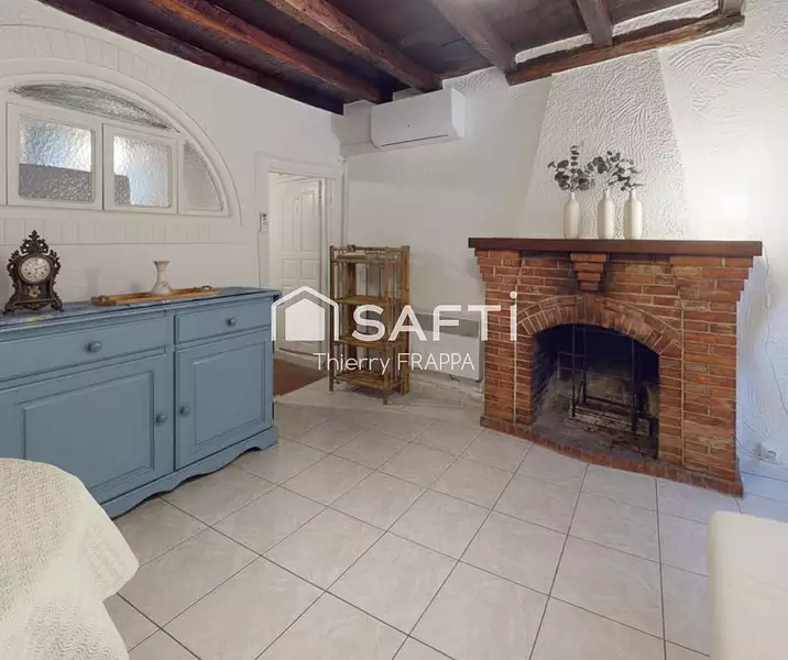 Le logement se compose d’un séjour lumineux marqué par une belle cheminée en briques et des poutres apparentes, donnant une vraie atmosphère de maison de village. La cuisine séparée, entièrement équipée (plaque vitrocéramique, lave-linge, rangements, chauffe-eau récent), est fonctionnelle et agréable au quotidien.