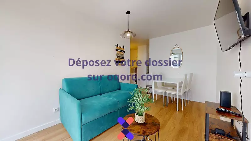 La pièce de vie est meublée avec un canapé convertible, une table à manger et ses 4 chaises, une table basse et une télévision.