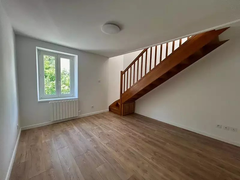 HAYANGE : Appartement F2 en duplex, (27.12 m² Loi Carrez - 42 m² au sol), excellent état, au 2ème et dernier étage, proche centre-ville et lignes de bus, composé d'une entrée, cuisine équipée, séjour, à l'étage supérieur un espace-chambre, salle d'eau équipée / WC, DV, chauffage individuel électrique. Classe énergie : E. Disponible à partir du 09/01/2026.