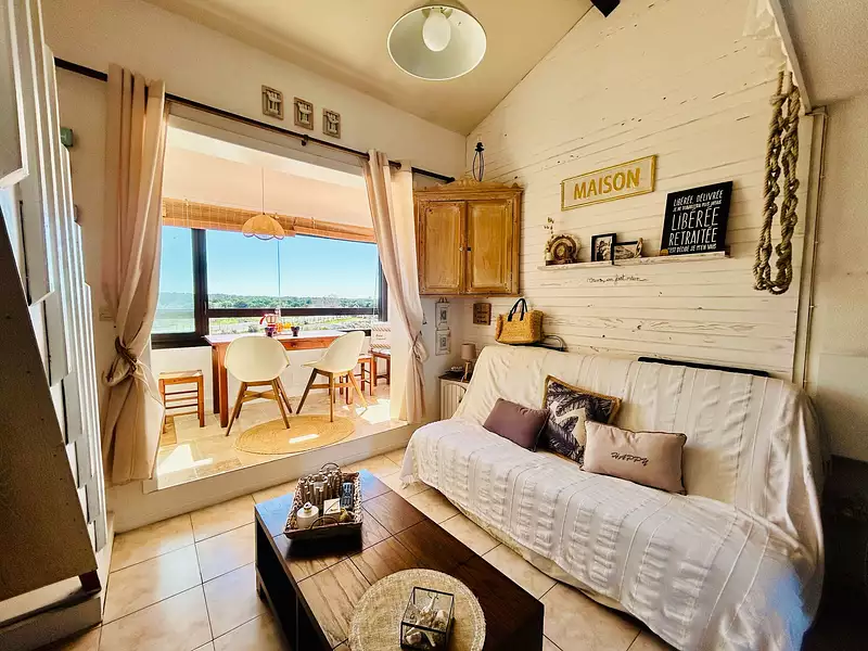 Le Barcarès Location de vacances : Venez vous détendre dans ce magnifique T2 mezzanine + cabine équipé pour 4 personnes, Situé au 3ème et dernier étage (sans ascenseur). Ce logement est composé d'une salle d'eau avec machine à laver, un salon séjour avec kitchenette, canapé TV, vous disposerez également d'une cabine avec 2 lits en 90 et une chambre en mezzanine avec un lit en 140. Vous vous détendrez sur une belle loggia avec sa vue imprenable sur le lac marin.Place de parking privative. En saison la résidence dispose d'une belle piscine.