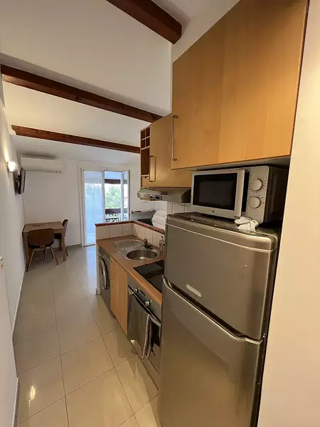 A Sausset les Pins, au calme dans une résidence proche mer, coquet appartement meublé Type 2 comprenant un coin cuisine équipée hotte, plaque, four, réfrigérateur, lave-linge et micro-onde, salle d'eau avec toilettes, séjour, balcon vue mer, chambre avec rangements.