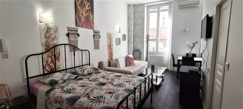 À louer à Marseille (13001) : appartement de 38 m² au 2e étage d'un immeuble. Le studio offre une pièce principale : une pièce à vivre avec un coin cuisine aménagée équipée à laquelle s'ajoute des toilettes. Vue sur rue.