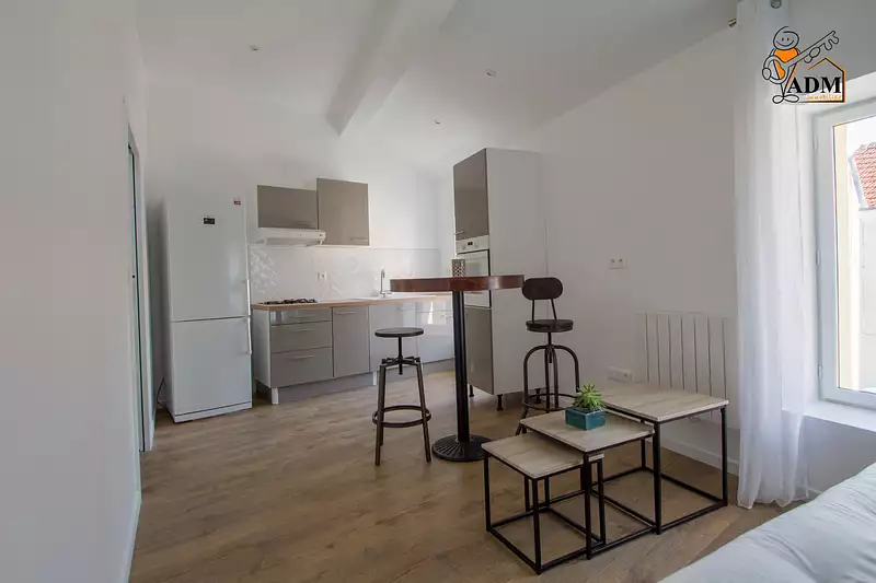 Très bel appartement en duplex loué meublé, (possibilité de louer vide). Il est composé : D'une entrée avec dressing, À l'étage, une grande pièce à vivre avec coin cuisine équipée et une chambre avec sa salle d'eau et WC.