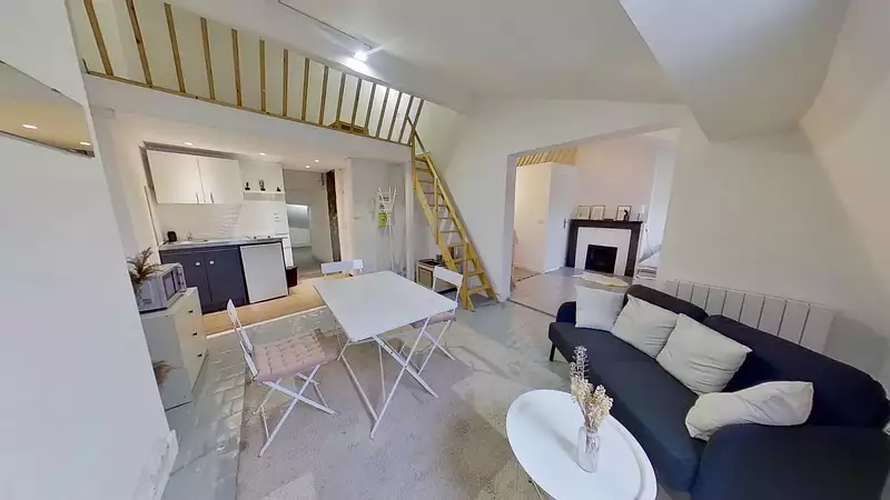 Appartement T1 bis meublé de 34.79m² au 6ème et dernier étage sans ascenseur, composé d'une pièce à vivre avec mezzanine et coin cuisine équipée et aménagée, un coin nuit avec une deuxième mezzanine, un espace bureau et un dressing, une salle d'eau, un coin buanderie. Climatisation.