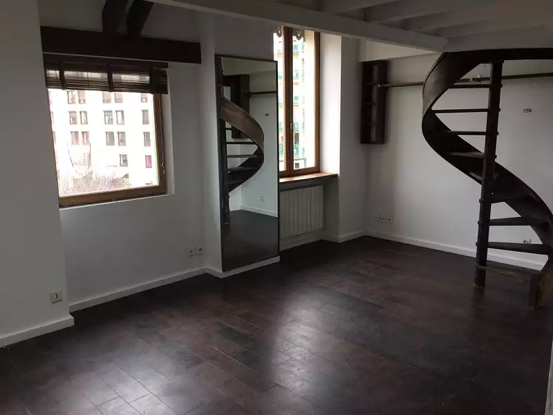 L'appartement se compose d'une cuisine ouverte, aménagée et équipée, donnant sur un séjour parqueté. Un escalier en colimaçon mène à une mezzanine dotée d'étagères. Vous trouverez également une salle de bains avec sanitaires.
