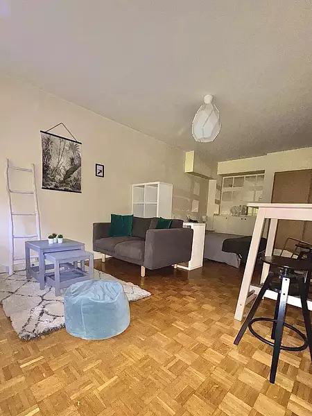 Résidence de 1975, appartement soigneusement meublé, offrant une vue sur un extérieur arboré. Il se compose d'une entrée, d'un séjour et d'une cuisine séparée entièrement équipée, d'une salle de bain avec baignoire et double vasque ainsi que de toilettes séparées.Le logement est loué avec une cave et un parking. Chauffage collectif.