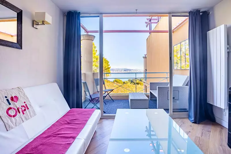 Nous avons le plaisir de vous présenter ce magnifique deux pièces vue mer dans une résidence privée à théoule sur mer, comprennent : Séjour, coin cuisine, chambre, salle de