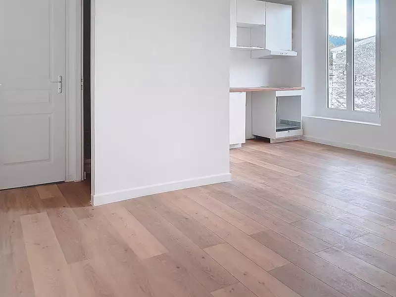 Entrée sur le séjour lumineux avec sa cuisine équipée ouverte, salle d'eau, WC séparé, 1 grande chambre avec placard.