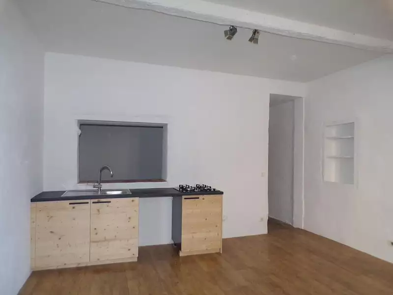 Appartement T1 de 38,41m² ( carrez ) au 1er étage dans ancienne maison de village en pierres, pleine de charme. Le studio est composé d'une belle pièce à vivre de 24,40m² avec cuisine ouverte, un coin nuit de 6,90m² et une salle de bains/wc de 5,20m²