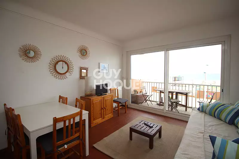 Appartement T2 d'environ 40m² + balcon vue Mer à louer de décembre à Juin. Il se compose d'une entrée desservant une chambre avec deux lits simples, une salle d'eau avec WC, d'une pièce de vie avec cuisine ouverte et accès au balcon vue mer. Disponible à partir de mi décembre