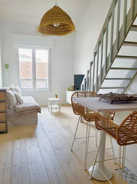 Appartement T2 bis de 42m² au sol, comprenant un séjour avec belle cuisine équipée, une chambre avec salle d'eau, une mezzanine, et un wc. Abonnement internet inclus. Chauffage électrique à inertie.