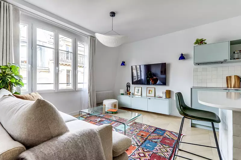 Bien que l'appartement soit entièrement neuf, il garde son charme typiquement parisien grâce à deux éléments conservés par le propriétaire : des fenêtres arrondies et un plancher en bois à chevrons (typique d'un immeuble parisien des années 1800). Les fenêtres ont été rénovées afin d'être dotées de double vitrage, ce qui maintient l'appartement calme et isolé.