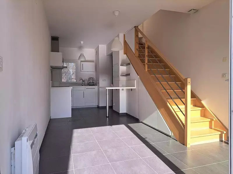 Rue Ledru Rollin - Un appartement type 2 comprenant une entrée avec cuisine équipée meublée ouverte sur le séjour donnant sur une terrasse, à l'étage une chambre, une salle de bains, un wc avec lave mains.