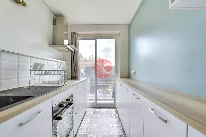 - Une cuisine équipée et aménagée (Four, Plaque, Hotte, Réfrégirateur), donnant sur un petit balcon.