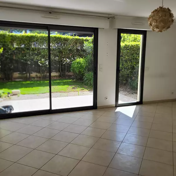 Studio en rez de jardin de 44,55 m2 avec séjour, cuisine équipée ouverte, coin chambre, salle de bains, WC, terrasse, jardin, en location vide à Villeneuve Loubet Plage. Loué avec un garage fermé. Résidence avec piscine, jardins. A deux pas des commerces et de la plage.