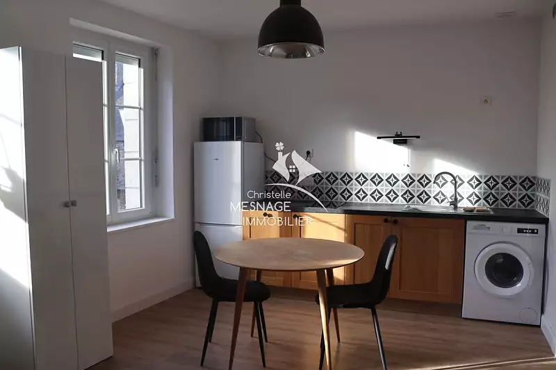 Bel appartement T2 bis MEUBLÉ de 43m² dans le bourg, au 1er étage d'une petite maison de 3 logements offrant : une cuisine équipée ouverte sur le séjour, une chambre, un bureau, une salle d'eau, un wc. LIBRE DE SUITE.