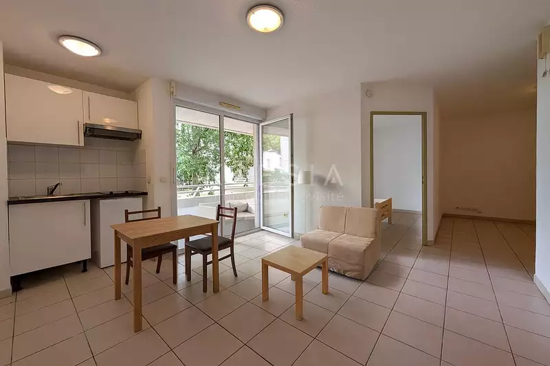 Appartement T2 meublé de 41 m², situé en rez-de-chaussée, avec une agréable terrasse de 6 m² offrant une vue dégagée sur le parc arboré de la résidence.