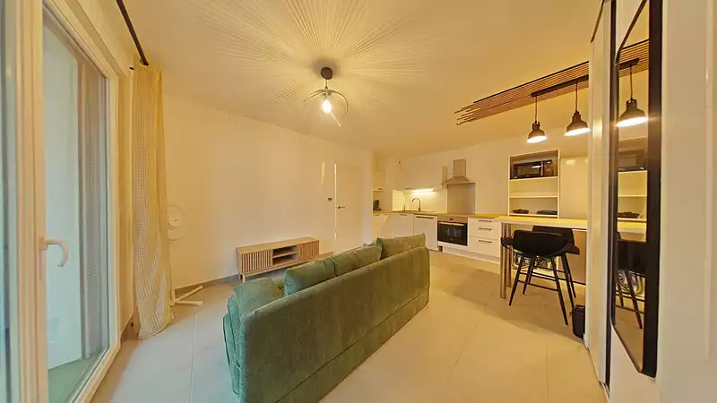 Entrée directe avec placard aménagé donnant sur la pièce de vie avec cuisine équipée (four, plaques induc, hotte, frigo, LV, MO) et également sur une terrasse couverte de 13 m², grande chambre indépendante avec placard aménagé & bureau, salle d'eau avec douche et meuble vasque, buanderie avec MAL et rayonnages, wc suspendu indépendant, chauff ind gaz, double vitrage alu, volets roulants manuels, ascenseur & visiophone, possibilité de parking couvert dans l'immeuble (30€/mois en supplément).