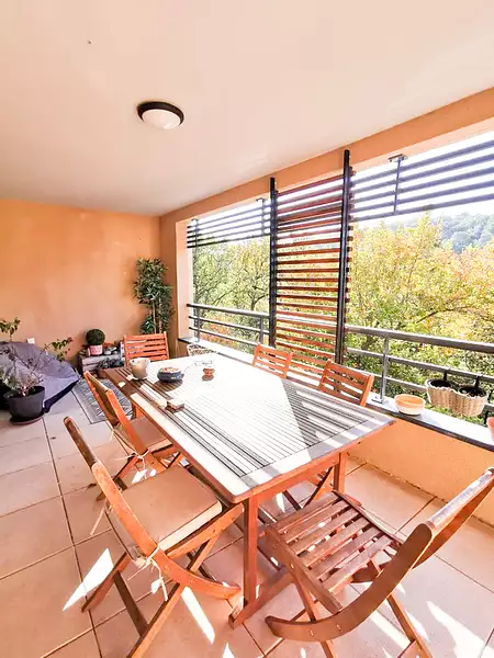 Aix Sud Appartement de type 2 Résidence Natura, immeuble récent basse consommation de 44,20m2 + terrasse 17 m2 , entièrement meublé (ex. : lit 140*190, canapé, chaises, table intérieure et extérieure) et équipé (ex. : réfrigérateur, lave-vaisselle, lave-linge, four, micro-onde, vaisselle, ustensiles pour cuisiner) terrasse de 17m2 vue sur la forêt. Exposition sud/sud-ouest.. Résidence sécurisée, place de parking + garage fermé. Lieu calme, bien situé au 1er étage avec ascenseur. loyer 950+120 €cc. hon: 572€TTC libre au 12 janvier 2026