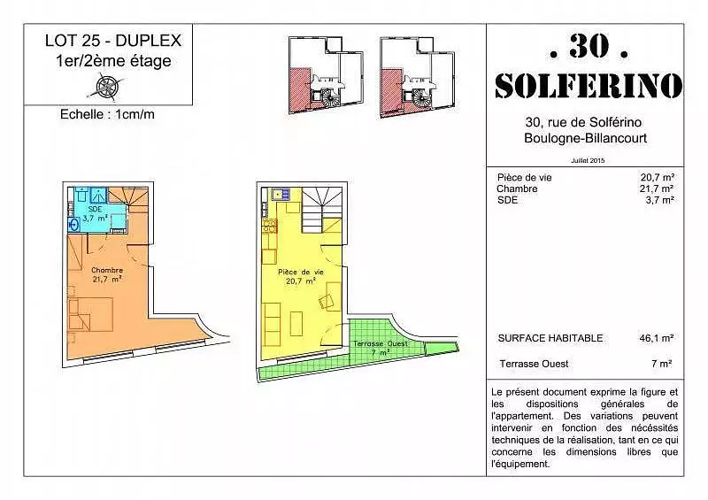 BOULOGNE SUD - PLACE DE SOLFERINO - L'agence Les Toits de Boulogne vous propose en exclusivité : un appartement duplex meublé de 45m² avec terrasse situé au 1er et 2ème étage d'un immeuble contemporain de 2019 de très bon standing - Comprenant : une belle pièce principale avec cuisine ouverte aménagée et équipée donnant sur une terrasse de 6m², une grande chambre, une salle d'eau avec toilettes - Très bon agencement - Clair et calme - Chauffage collectif - Proche des commerces et transports - Libre de suite - Contactez pour visiter l'agence : Les Toits de Boulogne - 225, Boulevard Jean Jaurès - 92100 Boulogne