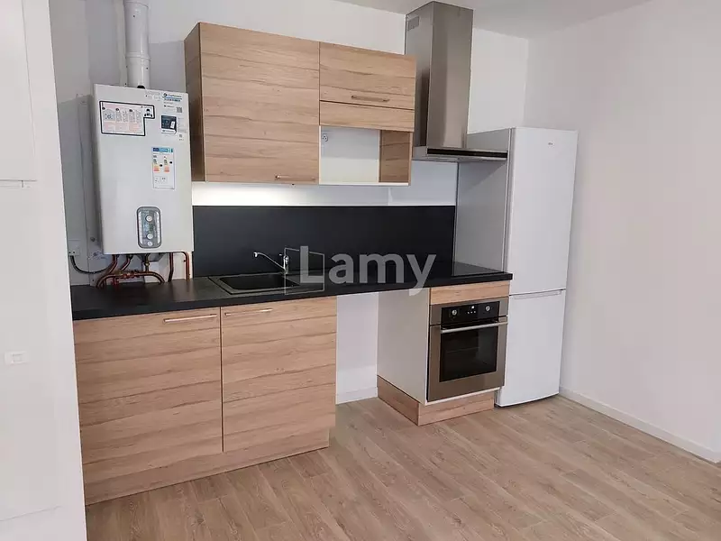 Appartement T2 meublé comprenant une pièce de vie avec une cuisine équipée d'un four, plaque hotte et réfrigérateur donnant sur un balcon, une chambre avec placard et une salle d'eau.