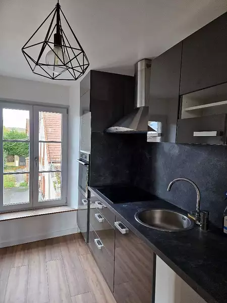 Appartement entièrement rénové, situé au 1er étage, offrant entrée sur cuisine aménagée et équipée (four + plaque + hotte), séjour, toilettes. A l'étage : chambre, salle d'eau. Libre de suite