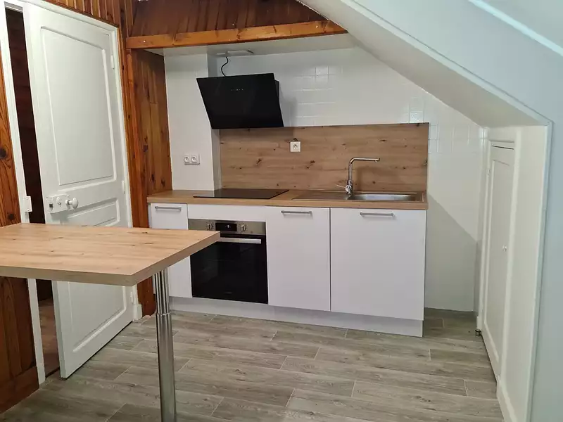Le Mont Dore, 8 Rue Maurice Sauvagnat, F2 refait à neuf, 2ème et dernier étage, entrée, cuisine équipée, séjour, chambre, petit bureau, salle de bains, chauffage électrique indépendant, DPE E « Montant estimé des dépenses annuelles d'énergie pour un usage standard : entre 1070€ et 1480€ par an. Prix moyens des énergies indexés sur l'année 2021 (abonnements compris). » libre de suite