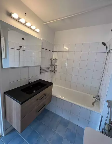 Salle de bain : Baignoire, machine à laver 8kg, et de nombreux rangements pour garder tout en ordre.