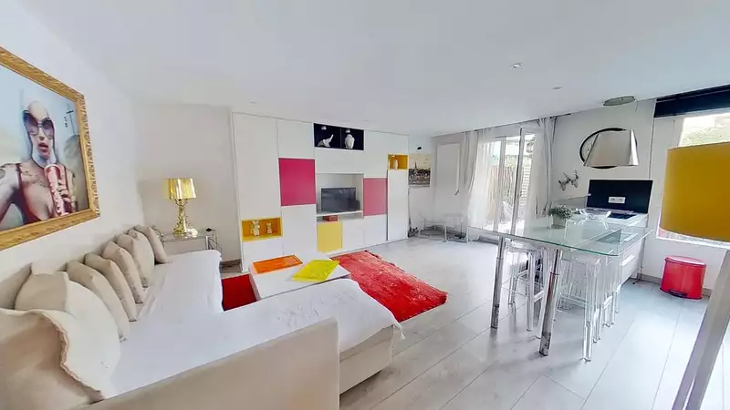 Appartement T2 meublé de 48.35m² composé d'une pièce à vivre ouvrant sur une grande terrasse aménagée et meublée, une cuisine ouverte aménagée et équipée (lave-linge, lave-vaisselle, réfrigérateur, plaques de cuisson, hotte, placards), une chambre avec placards, une salle d'eau, wc séparés, une cave.