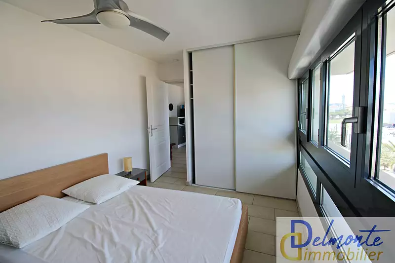 APPARTEMENT T2 MEUBLE AVEC PARKING - BAIL ETUDIANT/MOBILITE - LA SEYNE SUR MER : Dans le quartier Porte Marine, appartement T2 meublé de 50 m2 habitables, au 4ème étage avec ascenseur dans une résidence récente. Il se compose : d'une entrée avec placard, d'une cuisine aménagée et entièrement équipée, d'un salon avec vue mer, d'une chambre, d'une salle de douche et WC. Une place de parking en sous-sol.
