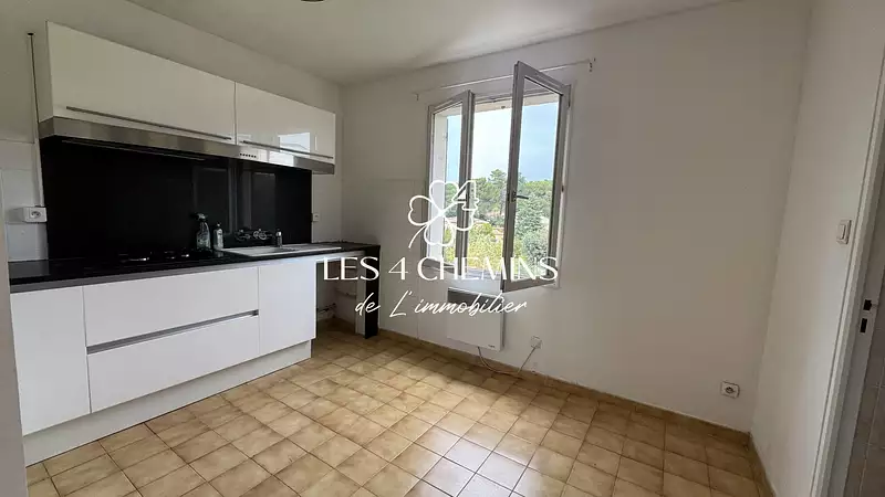 CABRIES - Appartement T2 d'environ 53m2 composé d'une cuisine séparée aménagée et semi équipée (cuisinière et hotte), un séjour lumineux donnant sur la terrasse. Une chambre et une petite pièce supplémentaire d'environ 4m2 pouvant servir de dressing ou bureau. Une terrasse spacieuse et un cabanon. Stationnement facile dans la rue. Mandat no305 .