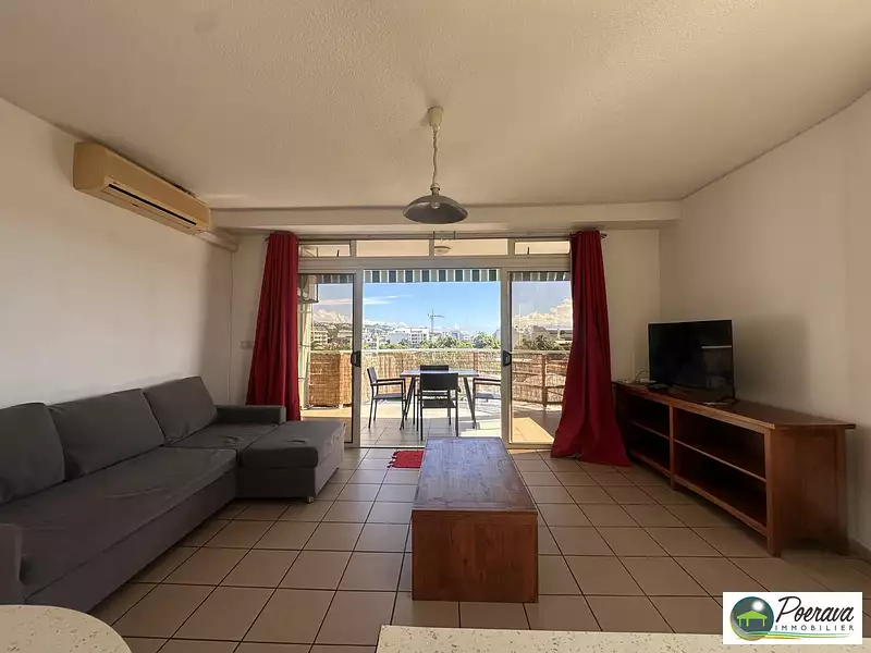 À louer à partir d'août 2025 : appartement de type F2 d'une surface intérieure de 52 m², complété par une terrasse couverte d'environ 12 m², offrant une vue panoramique sur Moorea.