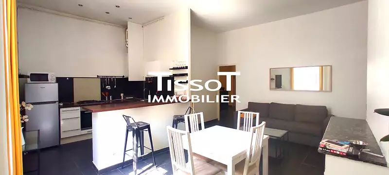 Agréable appartement de type 2 d'environ 54 m², loué meublé. Situé au 2ème étage de l'immeuble (sans ascenseur), cet appartement est composé d'une cuisine ouverte sur séjour, d'un dégagement desservant une salle de bains, un WC séparé et une chambre.