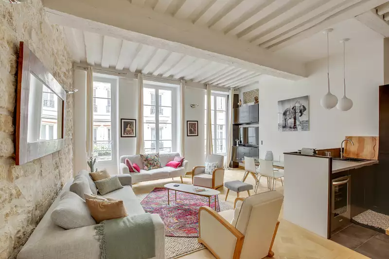 Élégant appartement meublé à louer, idéalement situé à deux pas du Jardin du Luxembourg Niché au coeur du très prisé 6? arrondissement de Paris, ce 2-pièces se trouve au 2? étage d'un charmant immeuble du XVIII? siècle, accessible par escalier. Situé dans une rue calme à proximité du quartier animé de l'Odéon, il offre un cadre de vie paisible, tout en étant à quelques minutes des restaurants, cafés, cinémas, et du célèbre Jardin du Luxembourg. Entièrement rénové avec des matériaux de qualité, ce bien de caractère allie le charme de l'ancien et le confort moderne. Poutres et pierres apparentes, parquet de Versailles, hauteur sous plafond de 3 mètres et trois grandes fenêtres baignent de lumière le spacieux salon/salle à manger. La cuisine ouverte, aménagée avec des matériaux haut de gamme, comprend un équipement complet et raffiné dont notamment un réfrigérateur à vin. Au calme, la chambre et la salle de bain donnent sur une cour intérieure. Elles offrent de nombreux rangements, une machine lavante-séchante et une grande douche. Les toilettes séparées avec lave-mains ajoutent au confort de l'ensemble. Ce coquet pied-à-terre, situé au coeur du centre historique de Paris, constitue un parfait refuge parisien.