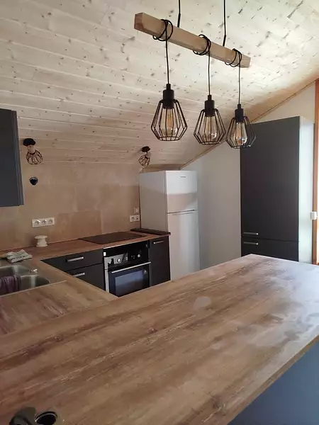 A l'étage, une cuisine équipée ouverte sur le séjour, une chambre, un bureau et une salle de bain/wc.
