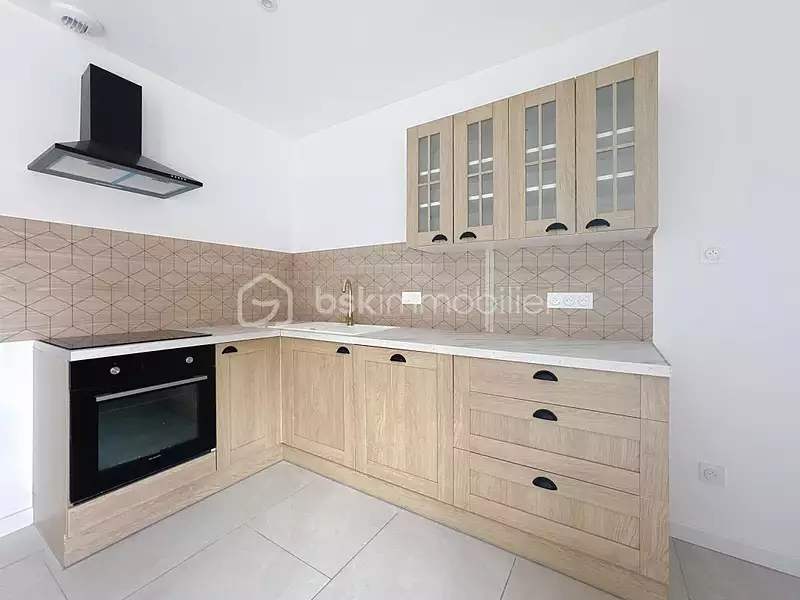 Appartement neuf en rez de jardin comprenant un bel espace de vie avec cuisine aménagée et équipée (lave vaisselle, hotte, plaque induction), une salle d'eau aménagée avec douche, vasque et rangement, sèche serviette, deux chambres équipées de dressing.