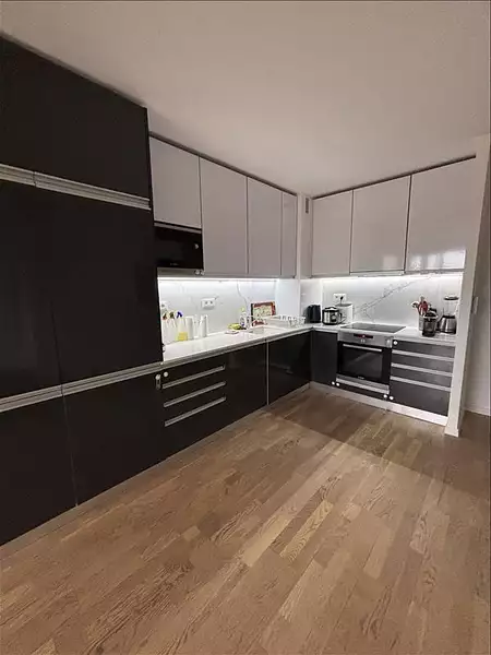 Une entrée, un séjour donnant sur le balcon avec une belle cuisine équipée ouverte.