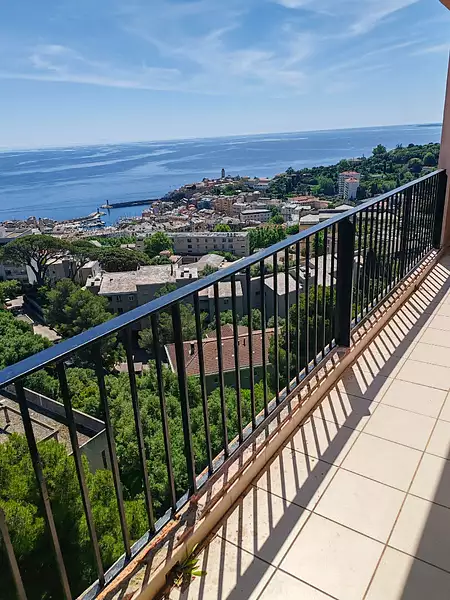 T3 + Garage double + Cave - Dans résidence calme surplombant Bastia et la mer , appartement avec ascenseur Résidence Super Bastia au 7ème étage comprenant un hall d'entrée + couloir avec placard, un séjour avec terrasse vue superbe mer, citadelle..., une cuisine partiellement aménagée, 2 chambres, une salle de bains (baignoire), un wc indépendant. Belle luminosité et ensoleillement (Cave en rez de chaussée +GARAGE double fermé). Loyer Charges Comprises : 850 euros mensuel