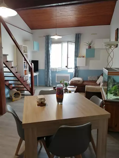 Marmande, proche centre ville, appartement type 2 bis en duplex, comprenant : séjour ouvert sur coin cuisine (rangements, hotte aspirante), chambre, salle de bains avec wc et en mezzanine : bureau ou salle de jeux et cabinet de toilette avec wc. Cellier individuel. Cour commune. Disponible fin décembre. Chauffage par convecteurs électriques - Loyer mensuel hors charges : 425€ + 25€ charges (parties communes et ordures ménagères) - Dépôt de garantie : 405€.