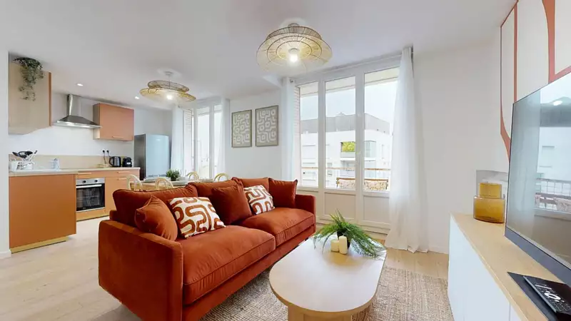 Cette colocation est composée de 3 chambres, d'un grand séjour de près de 23.61 m², avec cuisine ouverte totalement équipée et d'une buanderie (lave-linge/sèche-linge/kit ménage).