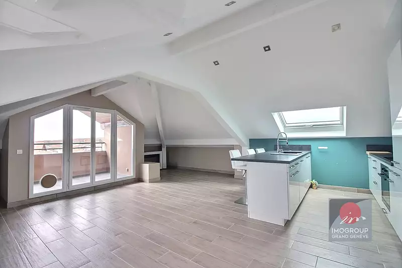 Au coeur du village de CHENS-SUR-LEMAN - Résidence Les Fleurets : Sous les toits d'une copropriété recherchée, charmant appartement T3 meublé mansardé, d'environ 61m2 hab. et 100m2 au sol. L'appartement comprend une belle entrée avec coin bureau desservant un grand salon avec cheminée électrique s'ouvrant sur un balcon couvert et une cuisine ouverte moderne équipée (plaque, four, hotte, lave-vaisselle, frigo/congélateur), deux chambres, une salle de bain avec baignoire et douche, WC séparés avec lave main. En annexe : une place de parking en sous-sol et une cave. Chauffage et eau chaude : ind. électrique Ses atouts : - proximité de la frontière (- 25 minutes en voiture de Genève Centre) - vue lac (5 minutes à pied de la plage) - dernier étage - très belle surface de la pièce de vie - T3 bis - Excellent état DISPONIBLE DE SUITE Avant toute demande d'envoyer votre dossier de candidature en amont. Postulez directement depuis notre site :